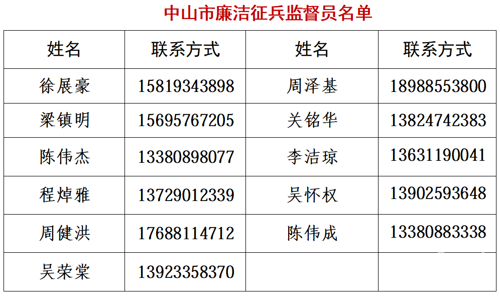 為嚴(yán)明兵員征集紀(jì)律,筑牢廉潔征兵底線,進(jìn)一步提升征兵工作透明度,中山市征兵辦將2026年我市廉潔征兵監(jiān)督員名單及監(jiān)督舉報(bào)電話、郵箱予以公布。廣大市民若發(fā)現(xiàn)征兵違法違紀(jì)線索或廉潔征兵問(wèn)題,可向廉潔征兵監(jiān)督員反映舉報(bào),也可直接撥打省、市監(jiān)督舉報(bào)電話,或發(fā)送郵件至指定信箱反饋。