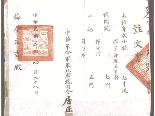 1916年,中華革命軍東北軍總司令居正向梅屋莊吉訂贈武器的訂贈單