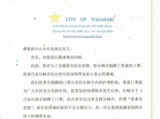 長(zhǎng)崎市市長(zhǎng)田上富久致中山市感謝信