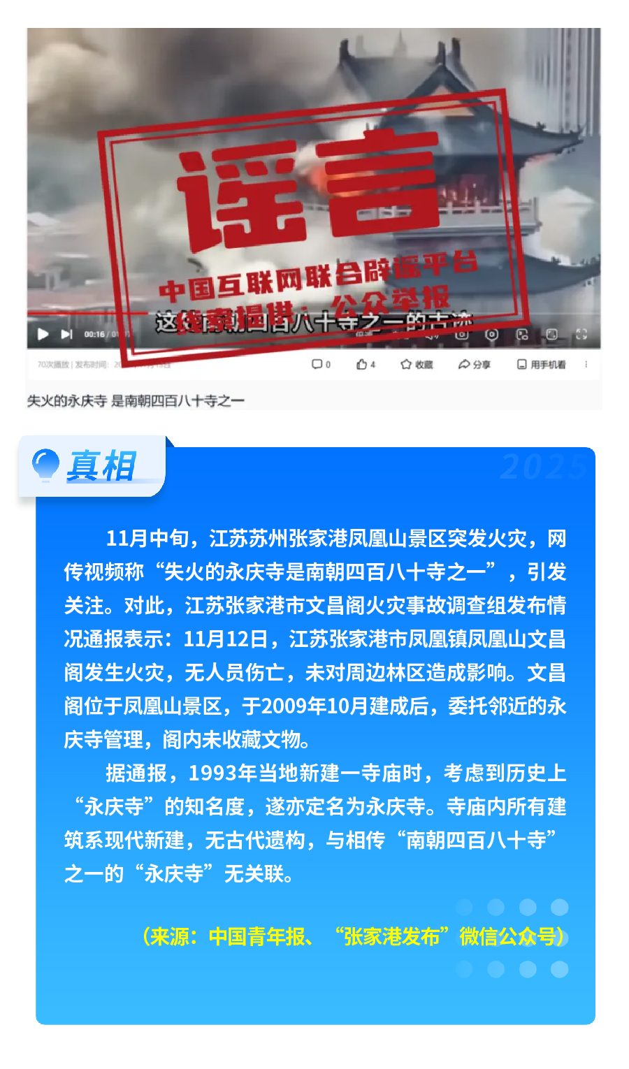 社會熱點事件被歪曲蹭炒。首屆“蘇超”聯(lián)賽泰州隊奪冠后,“冠軍獲五十萬獎金、城市地圖放大字號”等謠言流傳,以夸張信息博眼球、引流量;江蘇張家港鳳凰山景區(qū)火災(zāi)后,“‘南朝四百八十寺之一’被燒”的謠言引發(fā)熱議,通報顯示失火建筑為2009年新建,與歷史上的南朝寺廟無關(guān)聯(lián)。