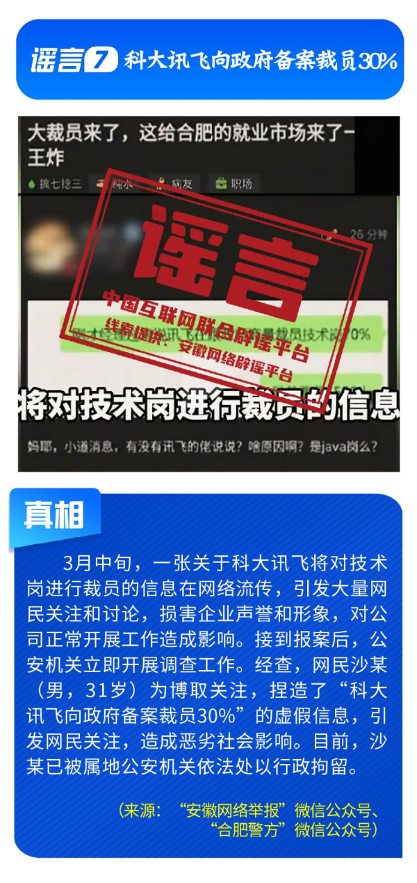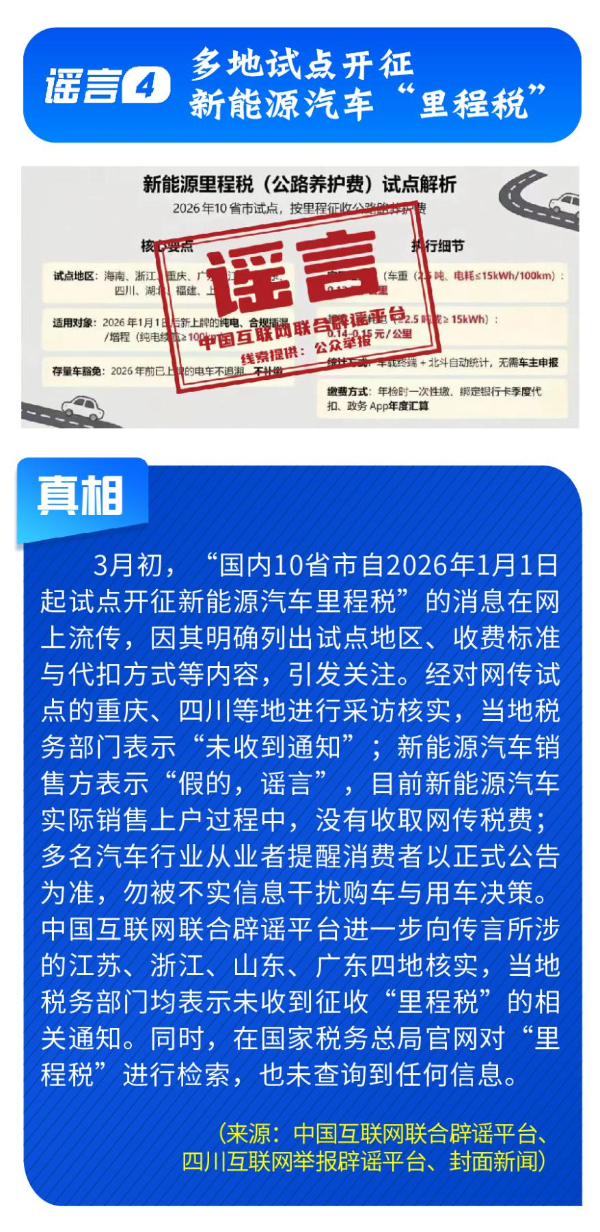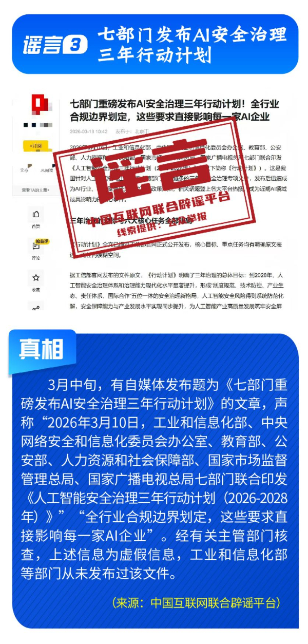 偽造政策文件,擾亂市場預(yù)期。《七部門重磅發(fā)布AI安全治理三年行動(dòng)計(jì)劃》完全是自媒體憑空杜撰,工信部等部門公開表示并無相關(guān)文件;“科大訊飛向政府備案裁員30%”系網(wǎng)民為博關(guān)注而捏造;“農(nóng)業(yè)銀行”發(fā)送高額貸款短信實(shí)為營銷號(hào)冒名發(fā)送,并非銀行官方行為;“深圳將禁行電動(dòng)自行車”是對(duì)管理措施征求意見稿的誤讀;“多地試點(diǎn)開征新能源汽車‘里程稅’”則列舉虛假試點(diǎn)地區(qū)與收費(fèi)標(biāo)準(zhǔn),已被多地稅務(wù)部門明確予以否認(rèn)。