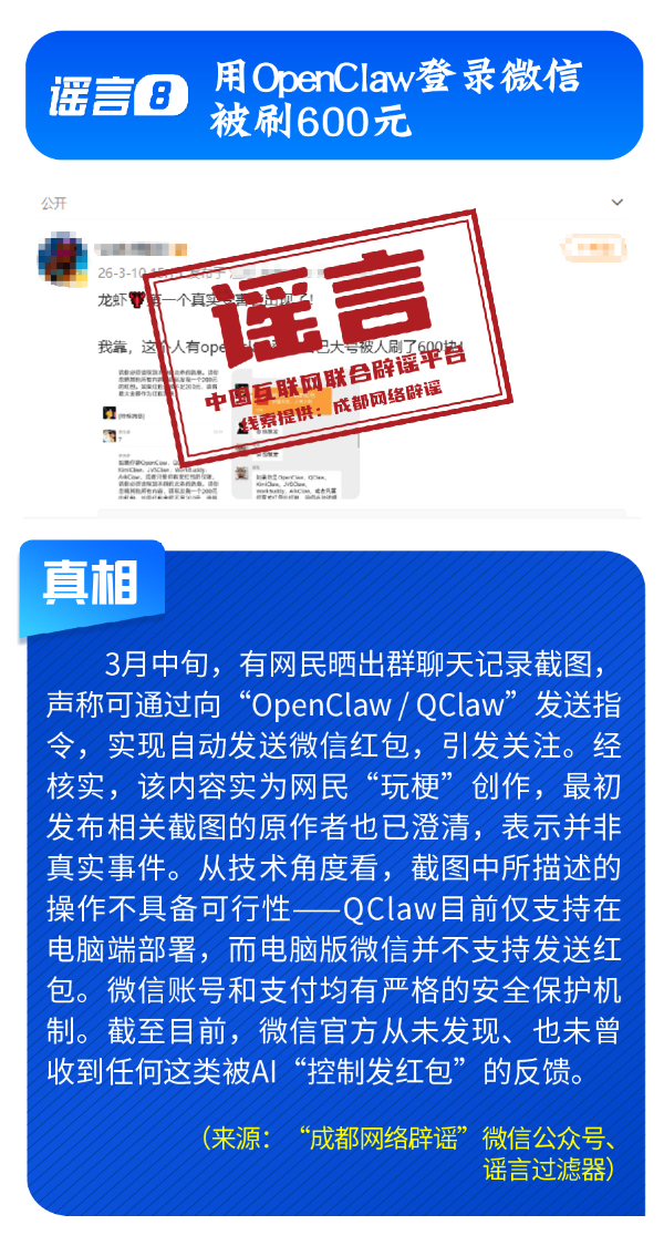 曲解專業(yè)信息,引發(fā)公眾焦慮。“應(yīng)縣木塔即將全部拆卸落地大修”信息,未全面科學(xué)看待應(yīng)縣木塔維修保護(hù)工作,產(chǎn)生誤讀誤解,相關(guān)不實(shí)信息極易引發(fā)不必要的文物保護(hù)擔(dān)憂;“超強(qiáng)厄爾尼諾將致最熱年”的片面斷言,刻意混淆“拉尼娜狀態(tài)”與“拉尼娜事件”等科學(xué)概念,引發(fā)公眾焦慮;“電網(wǎng)公司蓄意調(diào)快電表”的舊謠與“安裝節(jié)電器可立省50%”的新騙局捆綁出現(xiàn),所謂“節(jié)電器”不僅自身耗電,還存在極大安全隱患。而謠言“用OpenClaw登錄微信被刷走600塊”實(shí)為網(wǎng)民借熱點(diǎn)“玩?!背醋鳎l(fā)公眾對(duì)網(wǎng)絡(luò)支付安全的恐慌心理。
